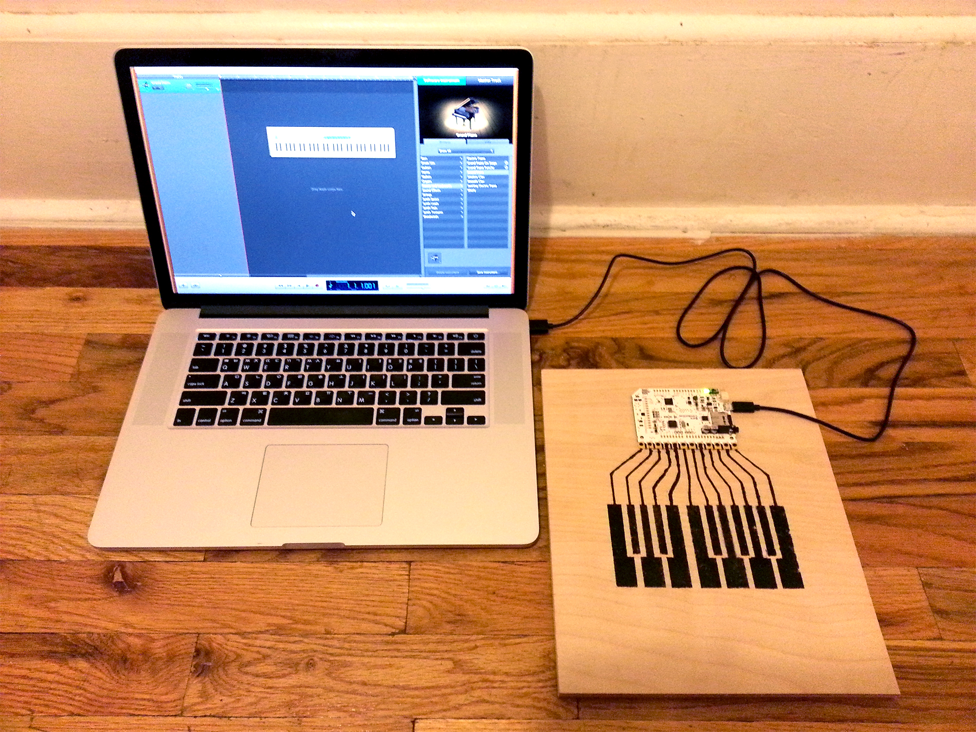 For Arduino mini project, I decided to make wooden piano keyboard with conductive paint and touchboard. I bought them in online store. On an wooden panel, I stenciled with conductive paint to make a piano keyboard. When conductive paint is dry, it becomes to flow over electricity. Each keyboards are connected to each nodes of touchboard with conductive paint. Code is made in order to connect each node to each musical notes. It can be realized in piano function of garage band in Mac.