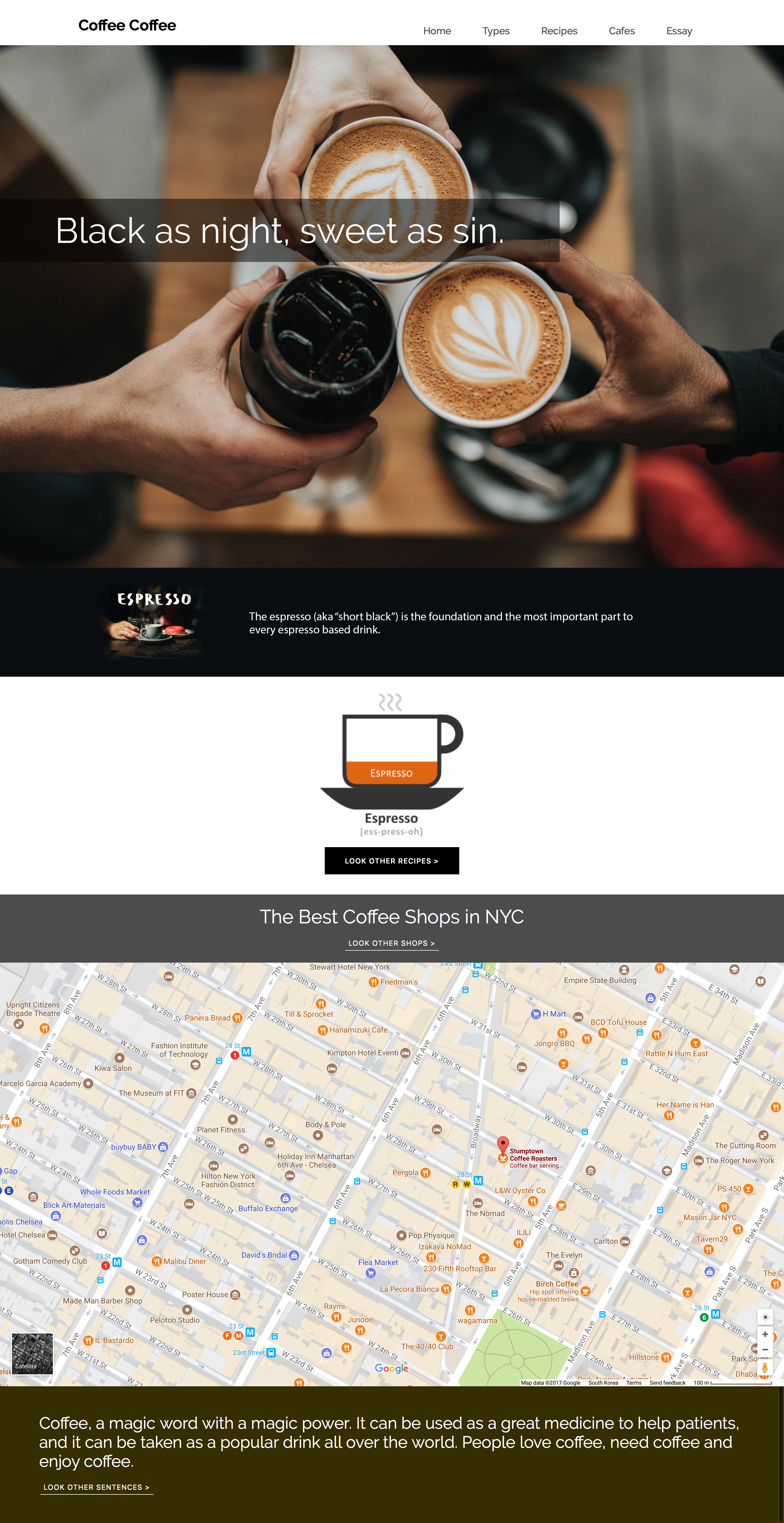 For my first Javascript project, I made an website which contains fun and useful information of coffee. This website includes quotes about coffee, explanation of different kinds of coffee, recipes, famous coffeehouse in NYC, and other quotes from coffee essay. Each contents are generated when the page is loaded, so that users can see the different information and images in each time the page is refreshed. Besides, recipes, coffee shop info, and sentences of coffee essay are generated by clicking the buttons. JQuery, Tracery, and Markov were used.