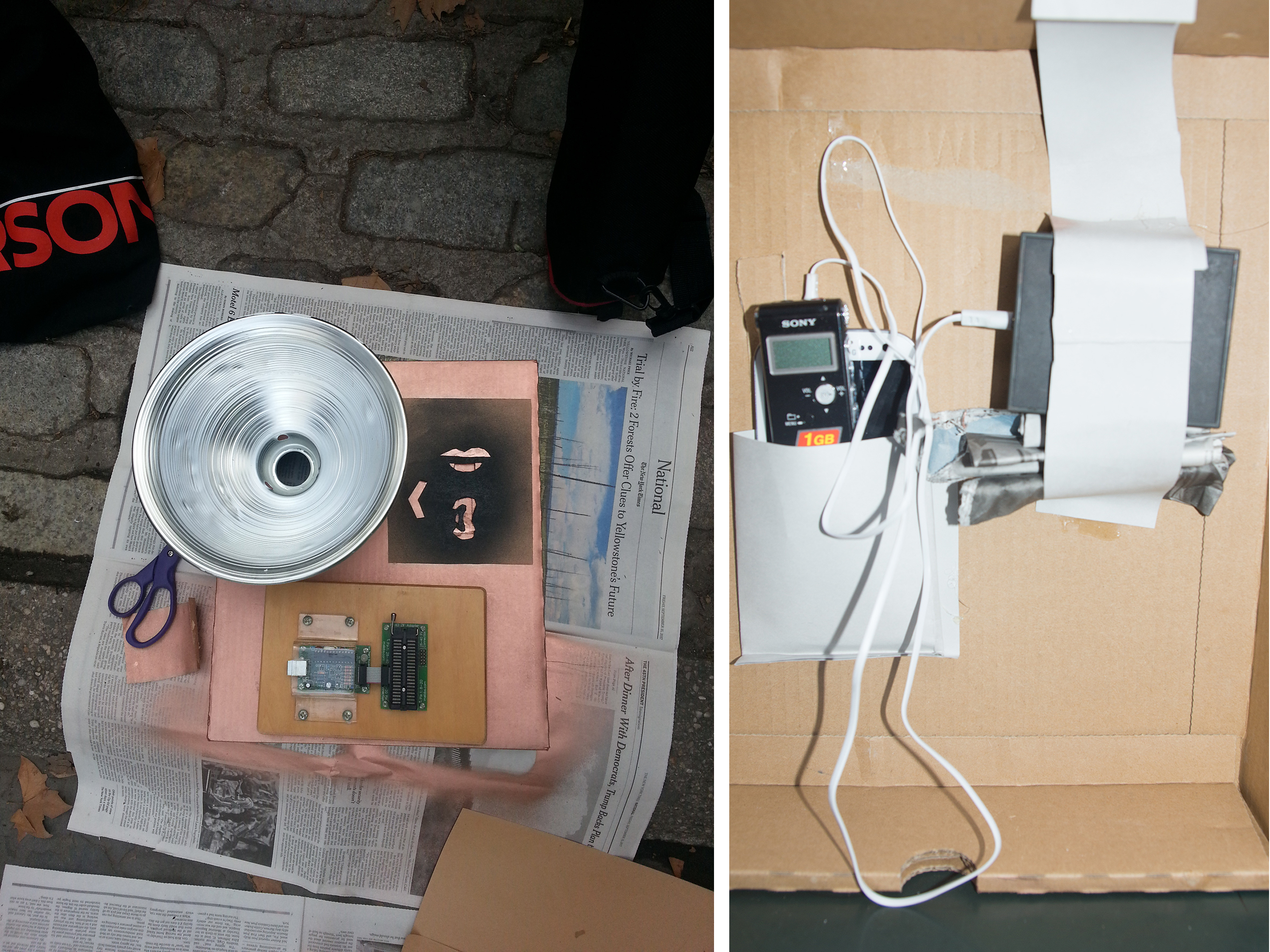 A communication machine contains two parts which are put separately to encourage strangers to talk and communicate through them. Walkie-talkies were put inside the two machines and attached to the internal surface of the machines. So that if users press and hold the specific part of the surface, the button of the walkie-talkie inside is automatically pressed. The cover was designed to be weird, unexpectful, and mysterious in order to attract people's attention. Lamp shade was used for talking and listening (icon of mouth), signal of "press to talk" was added.
