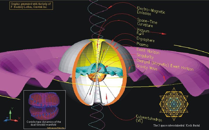 This marvelous research on geometry of universe tells us that based on Einstein's general theory of relativity, the vacuum singularity, as we know as the black hole, is not a specific phenomenon happened in specific location. It is not a pit hole that devour everything, rather it radiates, and creates. When the perfect balance between gravity and electromagnetism has made, there is an event horizon, and perfect "nothingness" can be there. But it is not a dead end. At the event horizon, where the collapsing geometry and electromagnetic radiation are equal, a constant energy transfer happens between the infinite potential of the vacuum and electromagnetic information – which implies continuous creation at the event horizon of black holes. In simple terms, energy pulsates into and out from the black hole, creating a feed-back loop of information transfer between infinite potential and finite form. More